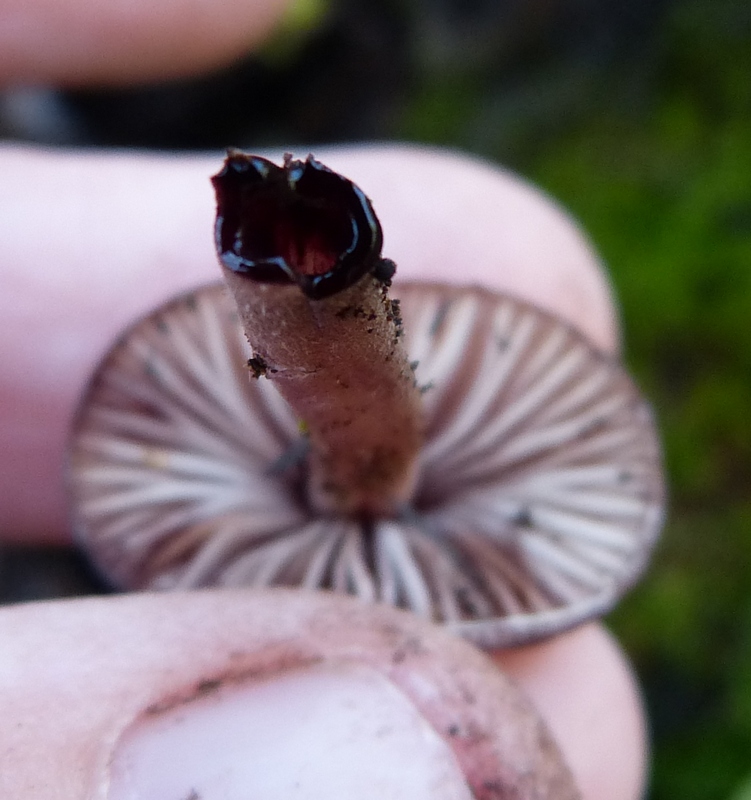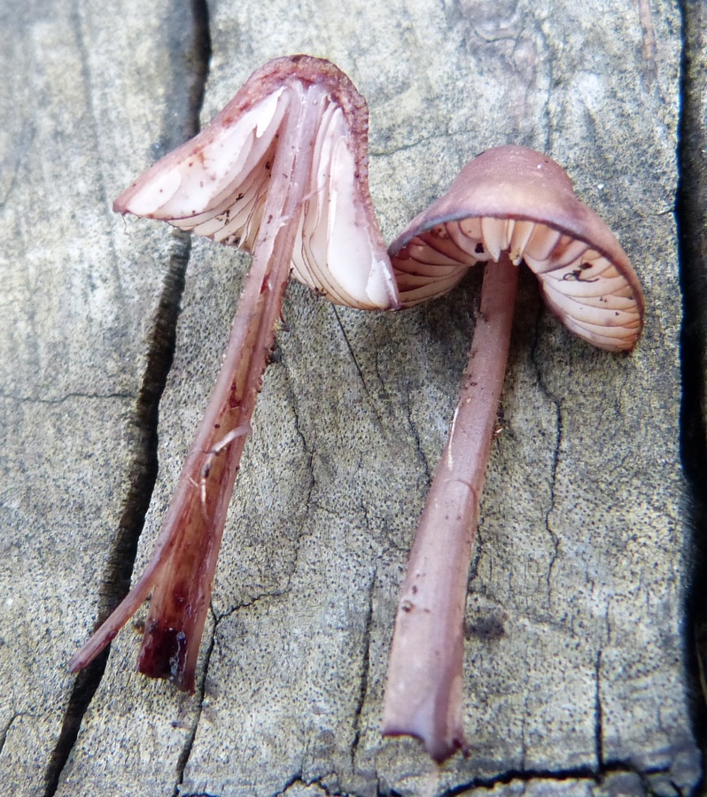 הרגל שבירה, חלולה, דקה, גלילית, מרכזית, חלקה או שעירה במקצת בחלקה התחתון, גובהה 4-8 ס"מ, עוביה 0,1-0,4 ס"מ. צבעה כצבע הכובע, חום-אפור-ורוד, חום-אדמדם, חום-ייני. בסיסי הרגליים של פטריות הגדלות צמוד זו לזו לעתים מחוברים.