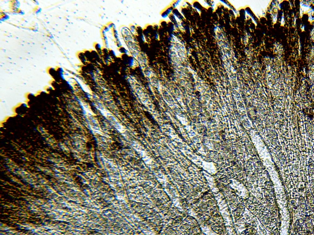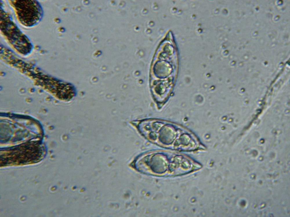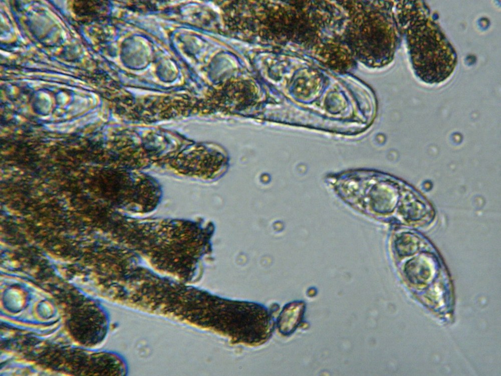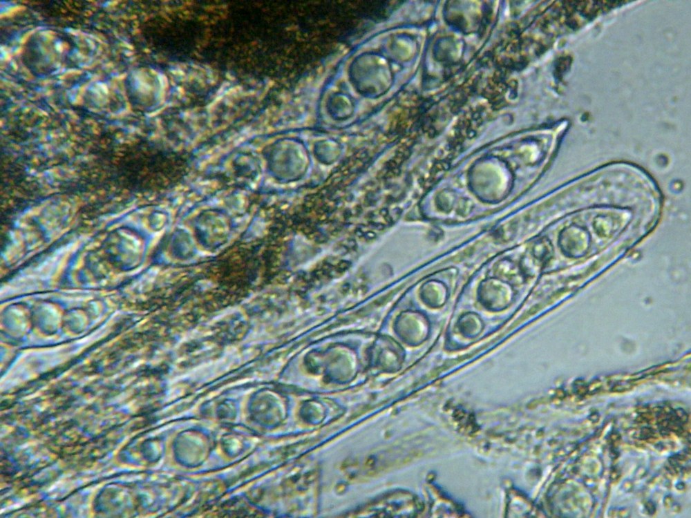 הנאדית מכילה 8 נבגים, גודלה 450-550*20-22 מיקרון, הנבגים אליפסואידיים או דמויי כישור וצרים בקצוות, חלקים, גדולים מאוד, עד 30-45*15-17 מיקרון, בעלי כמה טיפות שמן - אחת גדולה במרכז ו-2-3 מסביבה. אבקת הנבגים לבנה.