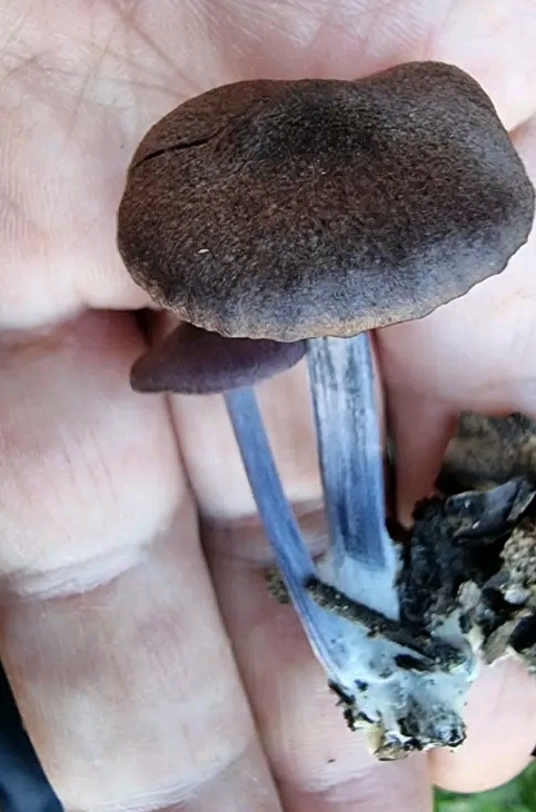 הרגל מרכזית, גלילית, דקה, ישרה או עקומה, סיבית לאורכה, משיית עם ברק, קמחית מעט בחלק העליון ובחלק התחתון מכוסה בתפטיר לבנבן. צבעה כחול-סגול, כצבע הכובע או בהיר יותר.