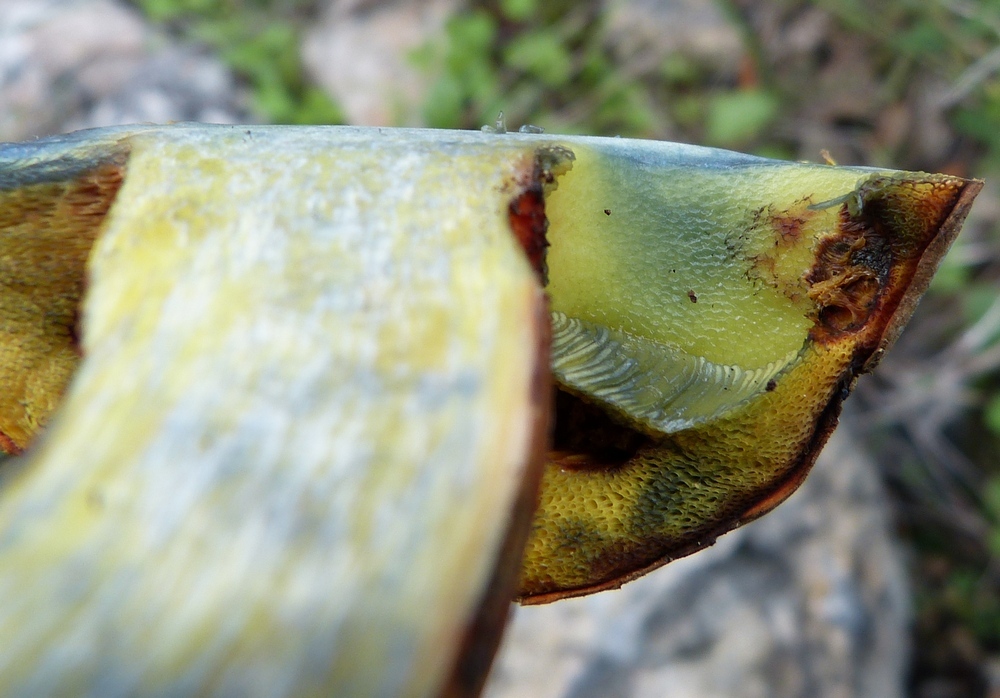 הנקבוביות בתחילה צהובות, עם הזמן מקבלות צבע חלודי. הצינורות צהובים-לימוניים, לאחר-מכן צהובים-זיתיים, מכחילים בלחיצה.
