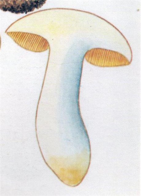 הבשר מוצק, צבעו לבנבן-צהוב המכחיל בצורה אינטנסיבית בשבירה ובחתך, במיוחד בכובע, בבסיס הרגל צבעו צהבהב ומשתנה פחות. אבקת הנבגים צבעה חום-זיתי. הנבגים בצבע צהבהב-חום-בהיר, דמויי כישור, צבעם 10-14*4,5-6 מיקרון.