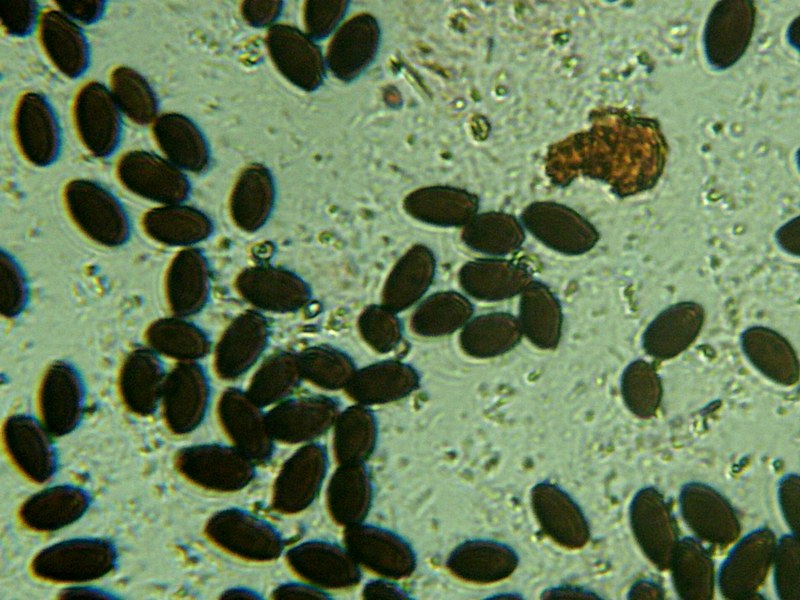 אבקת הנבגים שחורה או חומה-שחורה. הנבגים חלקים, אליפסואידיים, 10-14*6-8,5 מיקרון.