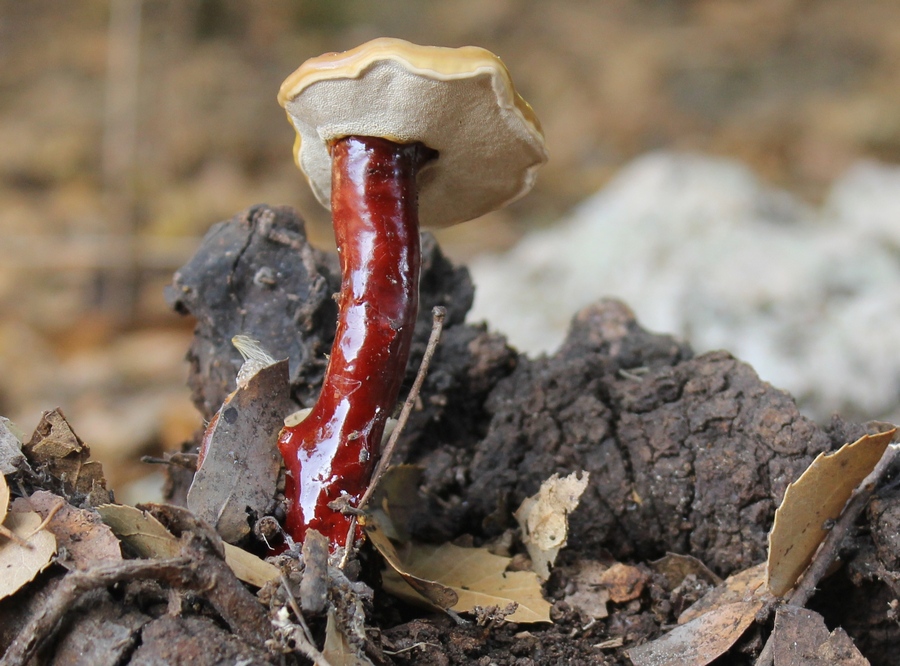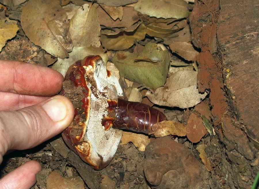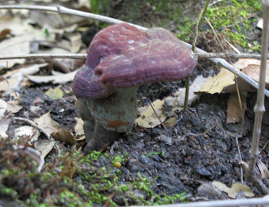 גוף הרביה חד-שנתי, לפעמים 2-3-שנתי, יושב או מחובר למצע על-ידי רגל מרכזית או צדדית, צורתו יכולה להיות פחוסה, חצויה, חצי-מעוגלת, דמויית מניפה או לא סדירה. קוטרו 10-25 ס"מ, רוחבו 3-8 ס"מ, עוביו 2-3 ס"מ. הרגל גלילית, ישרה או כפופה, מגיעה ל10-15 ס"מ באורכה ו-1-3 ס,מ בעוביה. פני הכובע והרגל מכוסים בקרום, שבתחילה צבעו אדמוני, אחר-כך אדמוני-ארגמני או אדום-כהה עד חום-ערמוני, עם הזמן הופך למבריק דמוי לכה. פני הכובע גבשושיים, לעתים מכוסים באבקה של הנבגים. השוליים בדרך כלל חדים, לפעמים גליים ומקופלים כלפי מטה, סטריליים וצרים בצד התחתון, צבעם בתחילה לבן, אחר-כך צהבהב או אדמוני, רוחבם 2-5 מ"מ. ההימנופור בעל נקבים. פני הנקבים בתחילה לבנבנים, אחר-כך בצבע קרם, ובהתיבשות הופכים לחומים-צהבהבים, בגופי הרביה הצעירים צבעם משתנה בלחיצה לחום-אדמדם. הנקבים מעוגלים או מצולעים, קטנים, 4-5 יחידות על 1 מ"מ. קצותיהם דקים. הצינורות בדרך כלל מסודרים בשכבה אחת, לפעמים ב-2-3 שכבות (כל שנה מתווספת שכבה), ובסך הכל מגיעים לעובי השכבה של 1-1,5 ס"מ, צבעם חום-צהבהב או חום-אדמדם. בשר הפטריה בתחילה ספוגי-דמוי שעם וצבעו קרם-לבן, אחר-כך הופך לקשה ומעוצה, ובאזורים הישנים הופך לחום-צהבהב או חום-אדמדם, בעל אונות לא ברורות, עוביו בבסיס הפטריה מגיע ל-3 ס"מ.