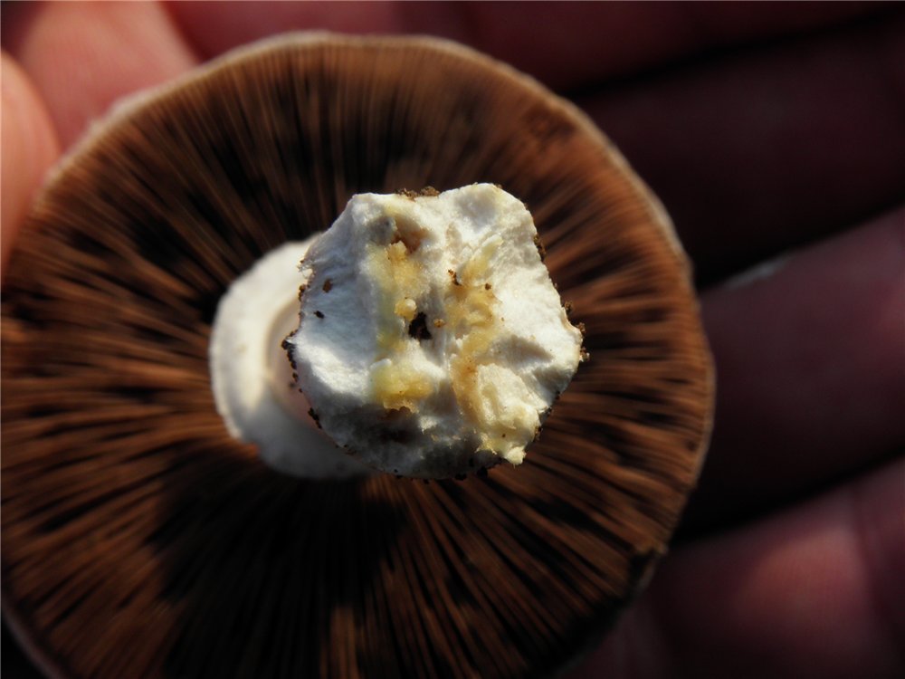 הבשר לבן, בחתך מצהיב במקצת בבסיס הרגל והופך לצהבהב או ורוד-עכור בכובע, טעמו לא טוב וריחו כריח של יוד או דיו.