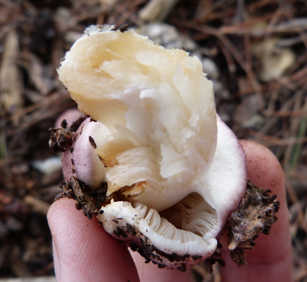 הדפים חופשיים, מעוגלים, די עבים, צבעם אפור-ורדרד, הופך לחום עד שחור-ארגמני בהבשלה.