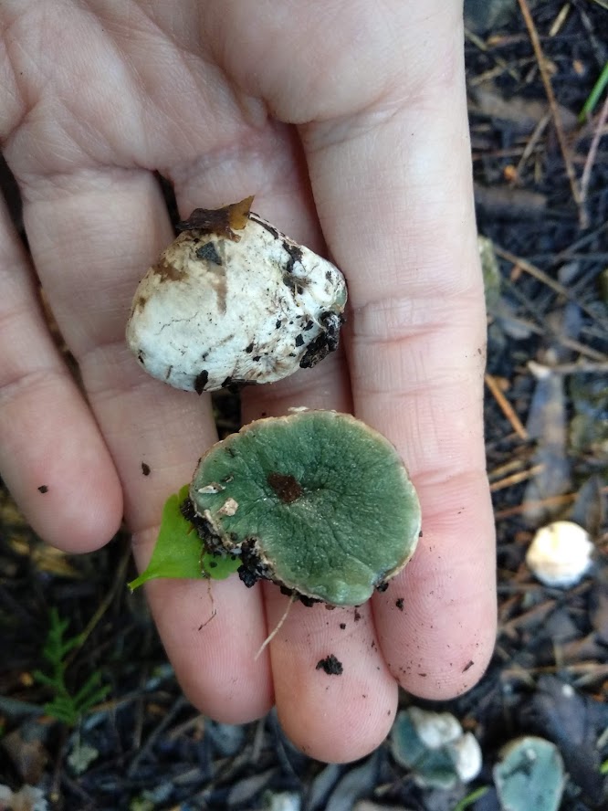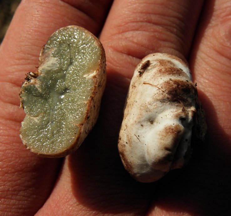 הגלבה (הבשר) סחוסית, צבעה בתחילה אפרפר בגוון טורקיז, כחלחל-ירקרק, אחר-כך הופך אפור-ירקרק-כהה או ירוק-זיתי, בנויה מתאים רבים מעוגלים או מאורכים, 3-5 יחידות בתוך מ"מ אחר, אשר מתפזרות בצורה רדיאלית סביב העמוד המרכזי (columella) ומתמלאים בנבגים. ריחו של הבשר חלש ולפעמים מזכיר ריח של פירות. טעמו של המעטה מר, ניתן להסיר אותו די בקלות מהשכבה הפנימית של גוף הרבייה.