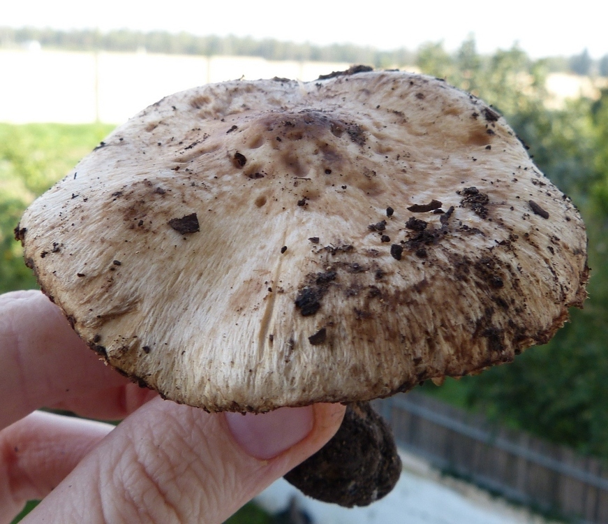 הדפים יושבים או בעלי מפרץ, לבנים-עכורים, לאחר-מכן צהובים-עכורים, קצותיהם בהירים.הרגל מוצקה, גלילית או בולבוסית במקצת בחלקה התחתון, קמחית בחלקה העלין, גובהה 8-4 ס"מ, עוביה 0,5-1,5 ס"מ, צבעה לבן בגוון ורדרד, אחר-כך מצהיב בחלקה העליון.