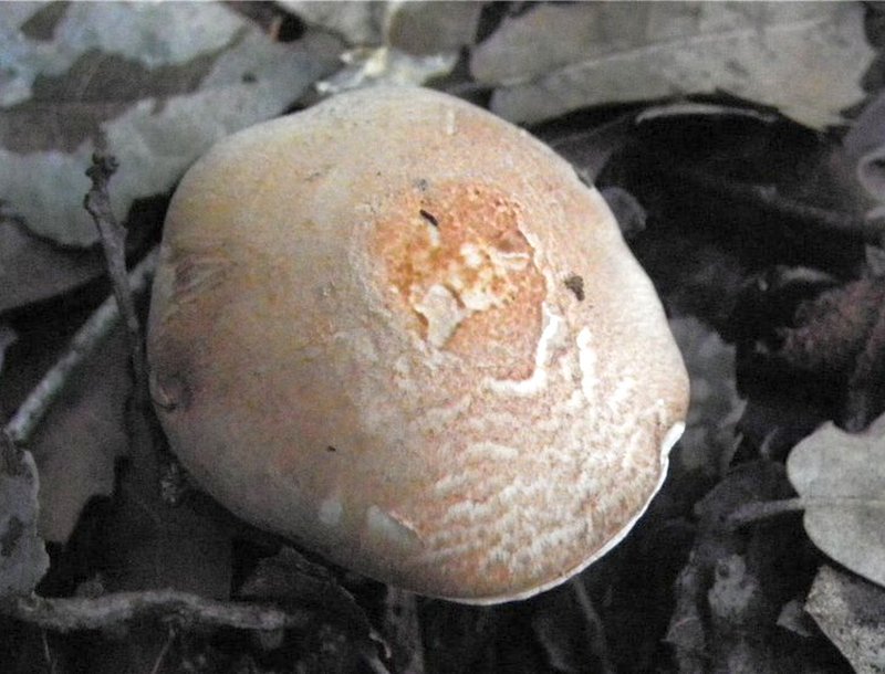 הכובע 1,5-4 ס"מ בקוטרו, בתחילה פעמוני, כיפתי, ונעשה קמור עד שטוח, בעל פיטם קטן בולט במרכזו. פניו סיביים, מכוסים בקשקשים קטנים בצבע חום-אוקר, חום-חלודי, חום-ייני, אפור-אדמדם, אפור-ורדרד על רקע לבנבן. שוליו דקים, סיביים, לעיתים נסדקים, מתרוממים כלפי מעלה או נעשים גליים. פניו של הכובע מאדימים במקצת בשפשוף.