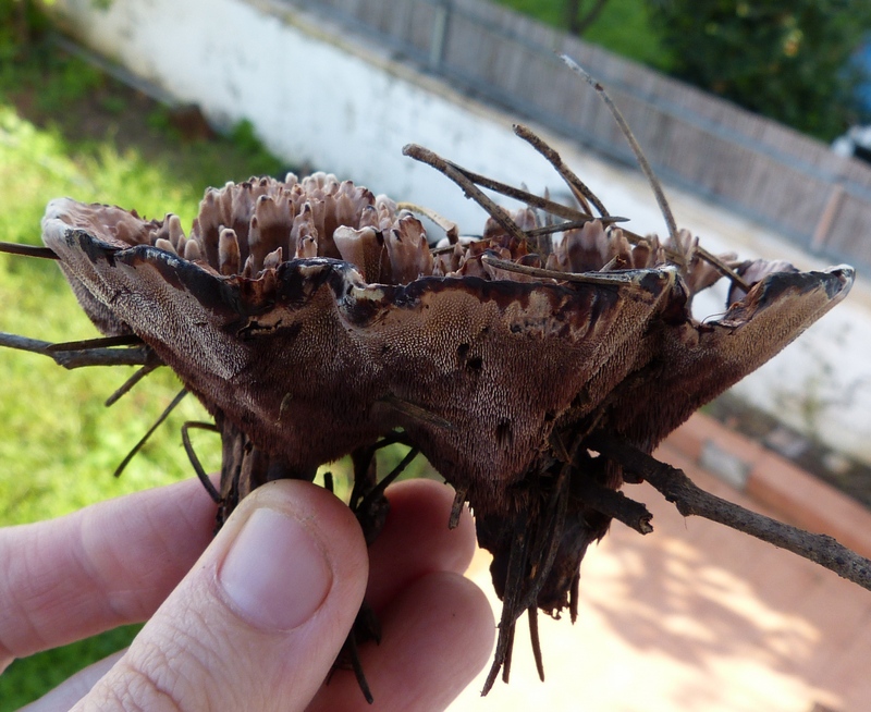 החלק החיצוני של הכובע מכוסה בשיניים דקות וצפופות המגיעות ל-3 מ"מ אורך. צבען בתחילה בהיר ועם הזמן הופך לחום, יותר בהיר בסמוך לשולי הכובע. בשפשוף או לחיצה הן מקבלות גוון חום-ייני.