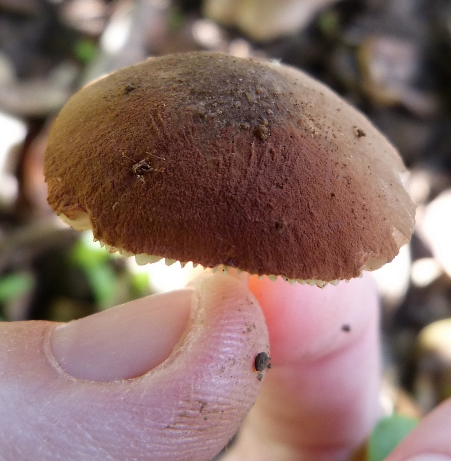 הכובע כיפתי, חרוטי, אחר כך קמור ונעשה שטוח, בעל פיטם ניכר. קוטרו 2-5 ס"מ. פניו מכוסים במקצת באבקה דמויית פיח, מקומטים בצורה רדיאלית: מהמרכז אל השוליים. צבעו חום, חום-כהה, חום בגוון זיתי, כהה יותר במרכז, לפעמים כמעט שחור.