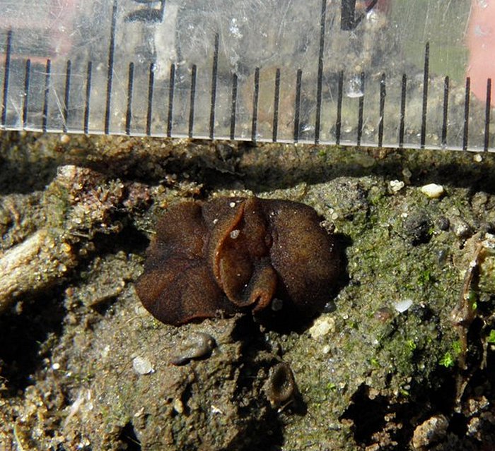 Плодовое тело сидячее, сперва чашевидное, затем плоское, блюдцевидное, 2-5(8) мм в диам. Поверхность гимения сперва от оранжевой до оливково-желтой, вскоре становится темно оливково-коричневой, фиолетово-бурой или черноватой, шероховатой из-за выступающих созревших сумок. Внешняя поверхность несколько светлее, покрыта чешуйками, край слегка зубчато-неровный.