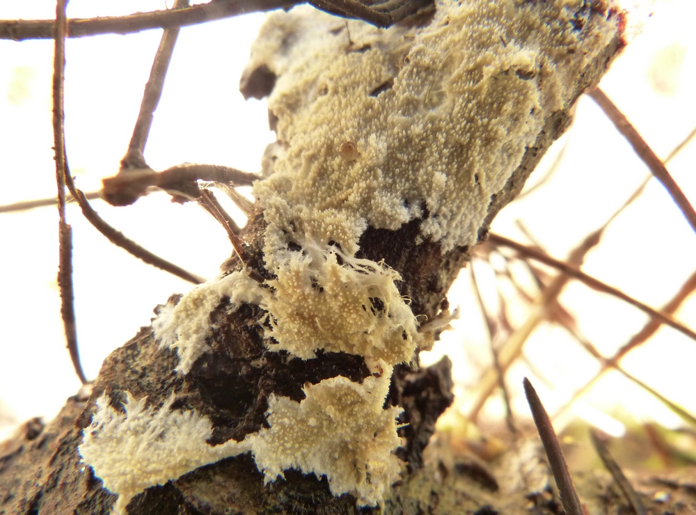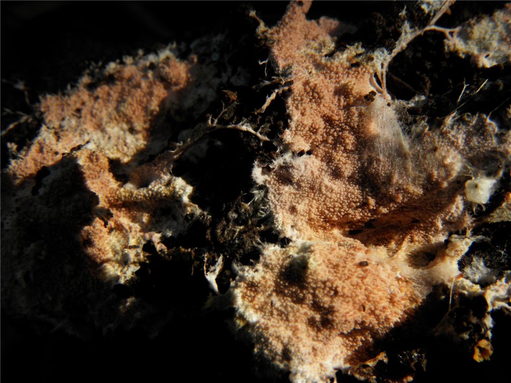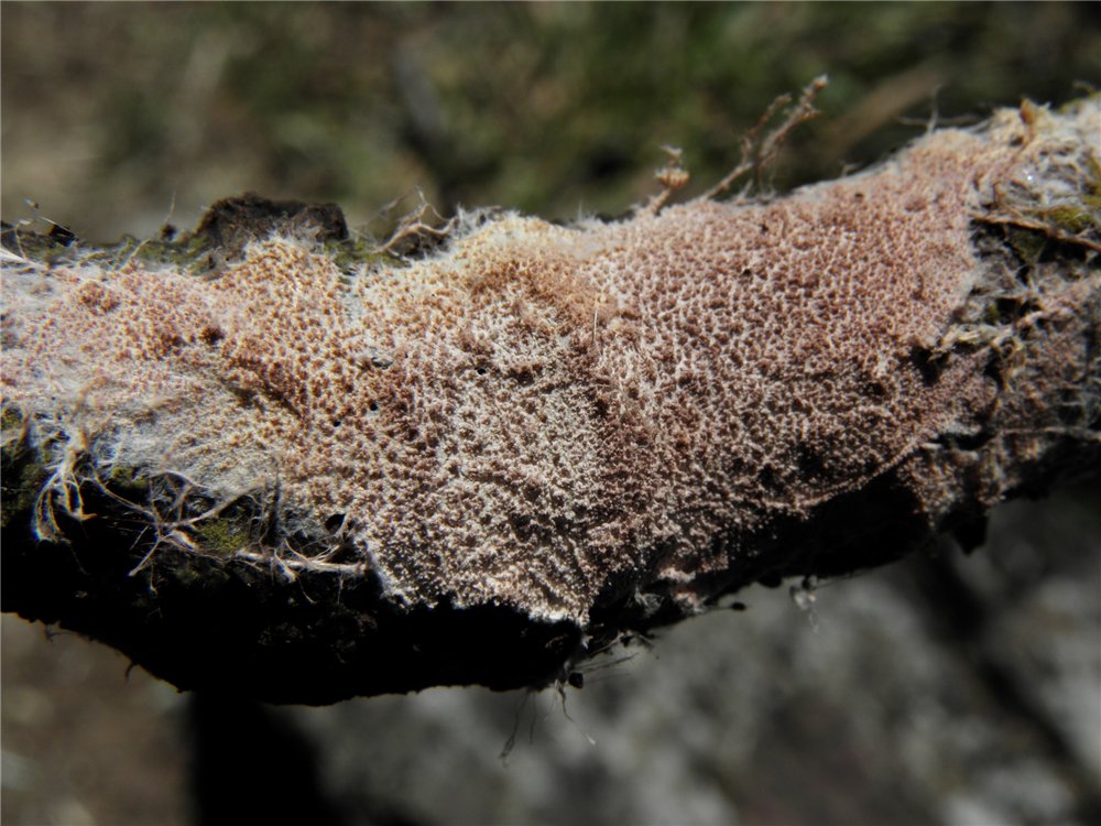 גוף הרביה זוחל, פרוס על המצע ומחובר אליו חזק, מכסים עד כמה סנטימטרים (עשרות סנטימטרים) של שטח המצע. פני גוף הרביה די מוצקים, קרומיים, לא ישרים, מקומטים, מגובששים, צבעם ורוד-אפרפר או לילכי-אפרפר, מאפיר בהתיבשות. הם מכוסים בליטות חרוטיות זעירות, כ-0,2-0,5 מ"מ בגובה, 4-5 יחידות על 1 מ"מ, שקצותיהן מפוצלים-מצוייצים. השכבה התחתונה דקה מאוד, 0,1-0,2 מ"מ בעוביה, צבעה כצבע הבליטות או בהיר יותר, לפעמים בצבע קרם. שוליה חוטיים, מצויצים, לפעמים בעלי חוטים ארוכים באורך של כמה סנטימטרים - ריזומורפים.