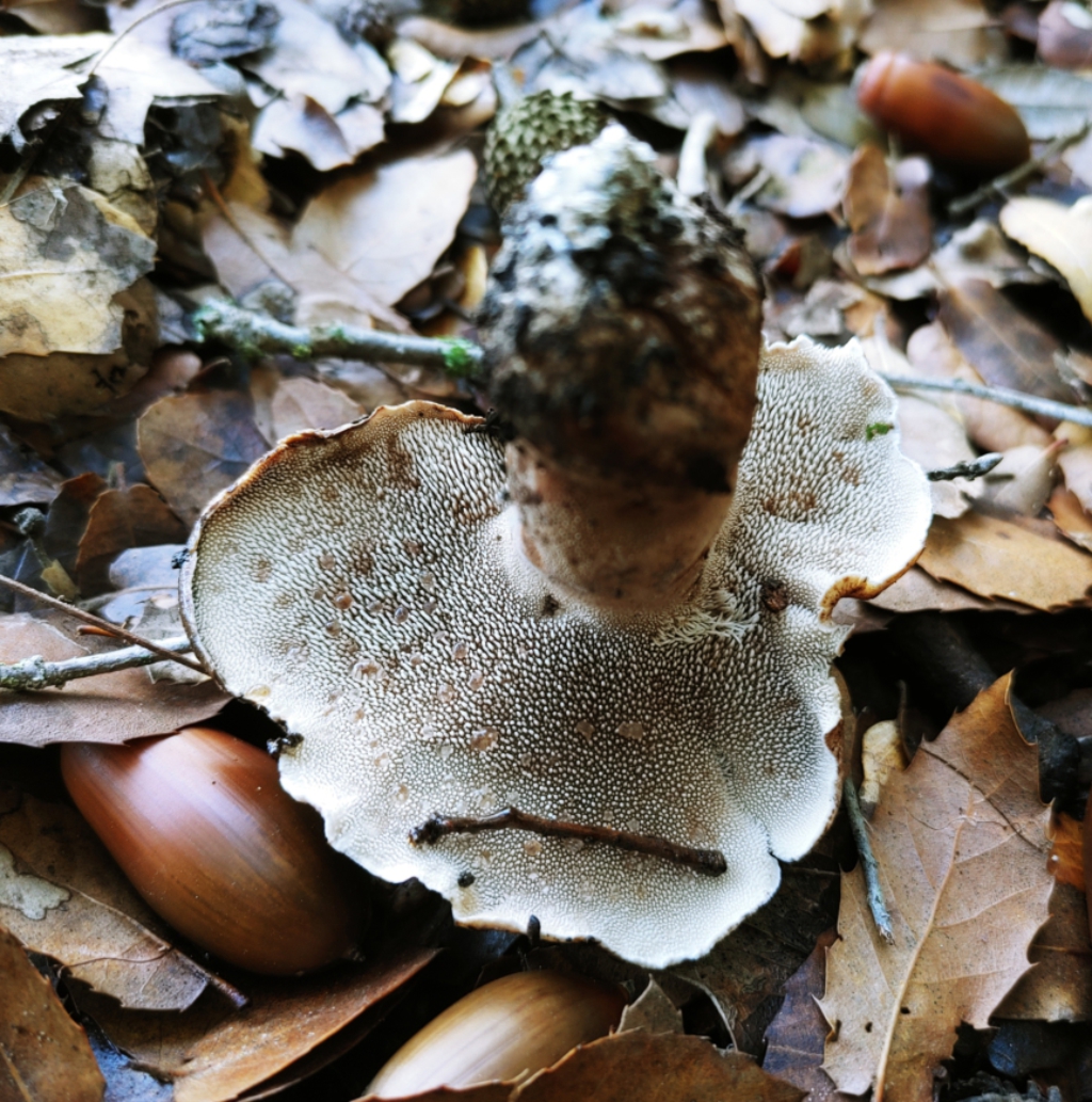 הרגל מרכזית או שנמצאת בצד הכובע, מוצקה, קשה, אטומה, די עבה ולא ממש ארוכה, 4-6 ס"מ באורך ו-3-4 ס"מ בעובי, בדרך כלל הולכת צרה יותר כלפי מטה. צבע הרגל כצבע הכובע, חום-בז' או חום-אדמדם, עם כיסוי לבנבן או אפרפר של התפטיר בבסיס, לפעמים עם גוון כחול-אפור בחלק התחתון.